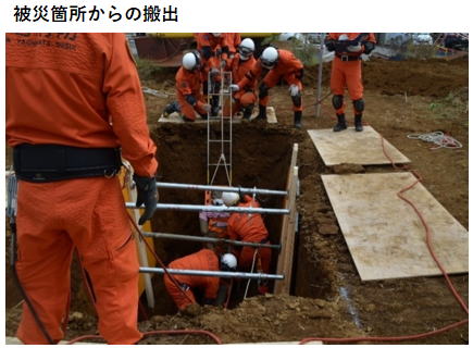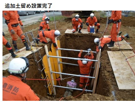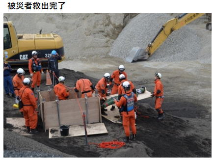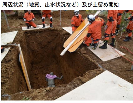 今回の訓練内容としては「41人の消防隊員が土砂崩れを想定し、被災者の救出とガードパネルを使った土留め作業」を実施しています。この訓練は、大規模災害における座屈倒壊および土砂災害現場を想定したもので、当社の重機やドリルなどを用いてコンクリートの破壊要領や瓦礫上の歩き方など狭い空間での救出活動の技術向上を図るものとなっています。